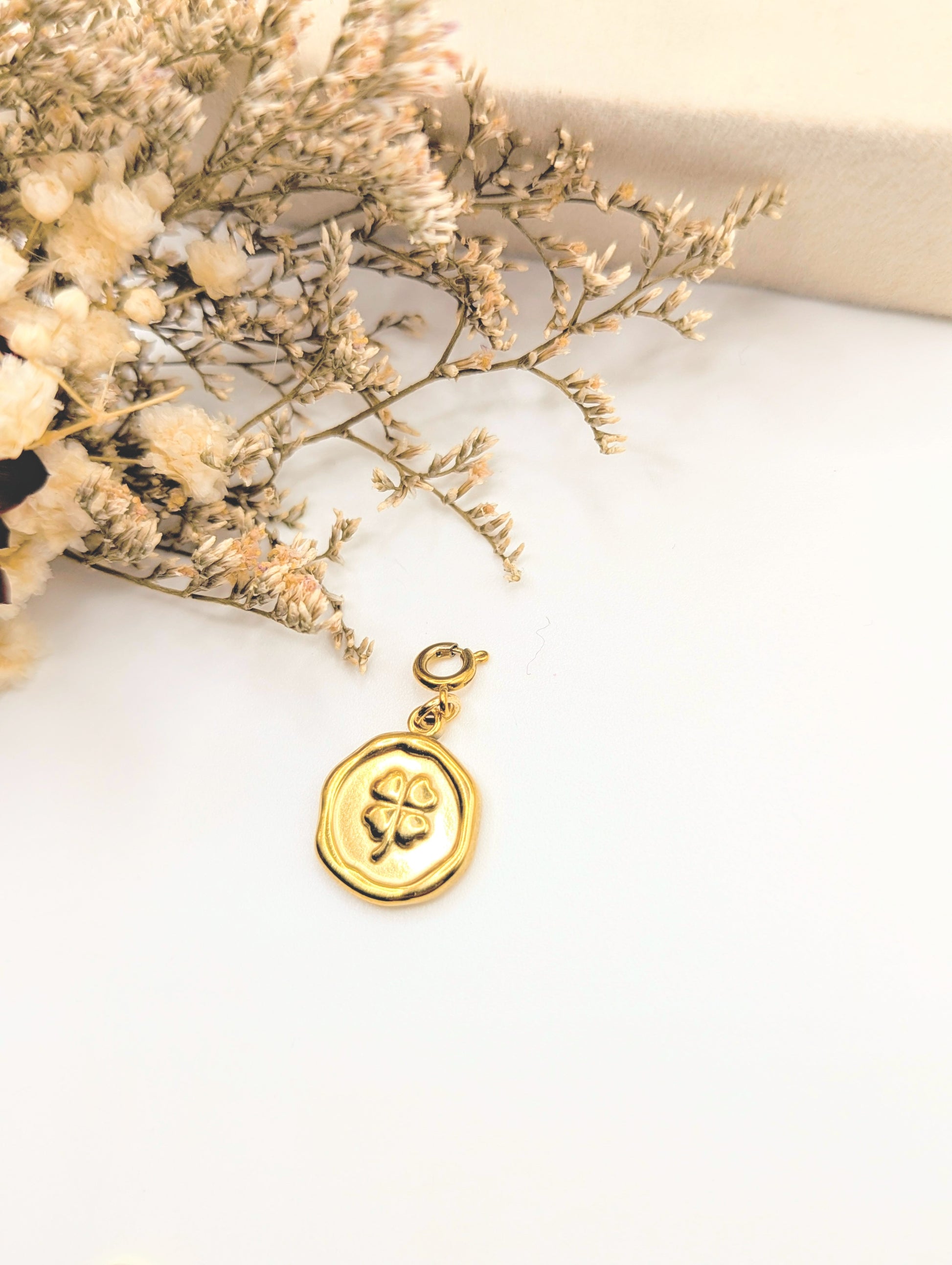 Embrace good fortune with the Gold Four-Leaf Clover Coin Charm. Featuring a beautifully detailed four-leaf clover set within a classic coin design, this charm symbolises luck, positivity, and elegance. Perfect for bracelets, necklaces, or keychains, it adds a touch of meaningful sophistication to any accessory collection..