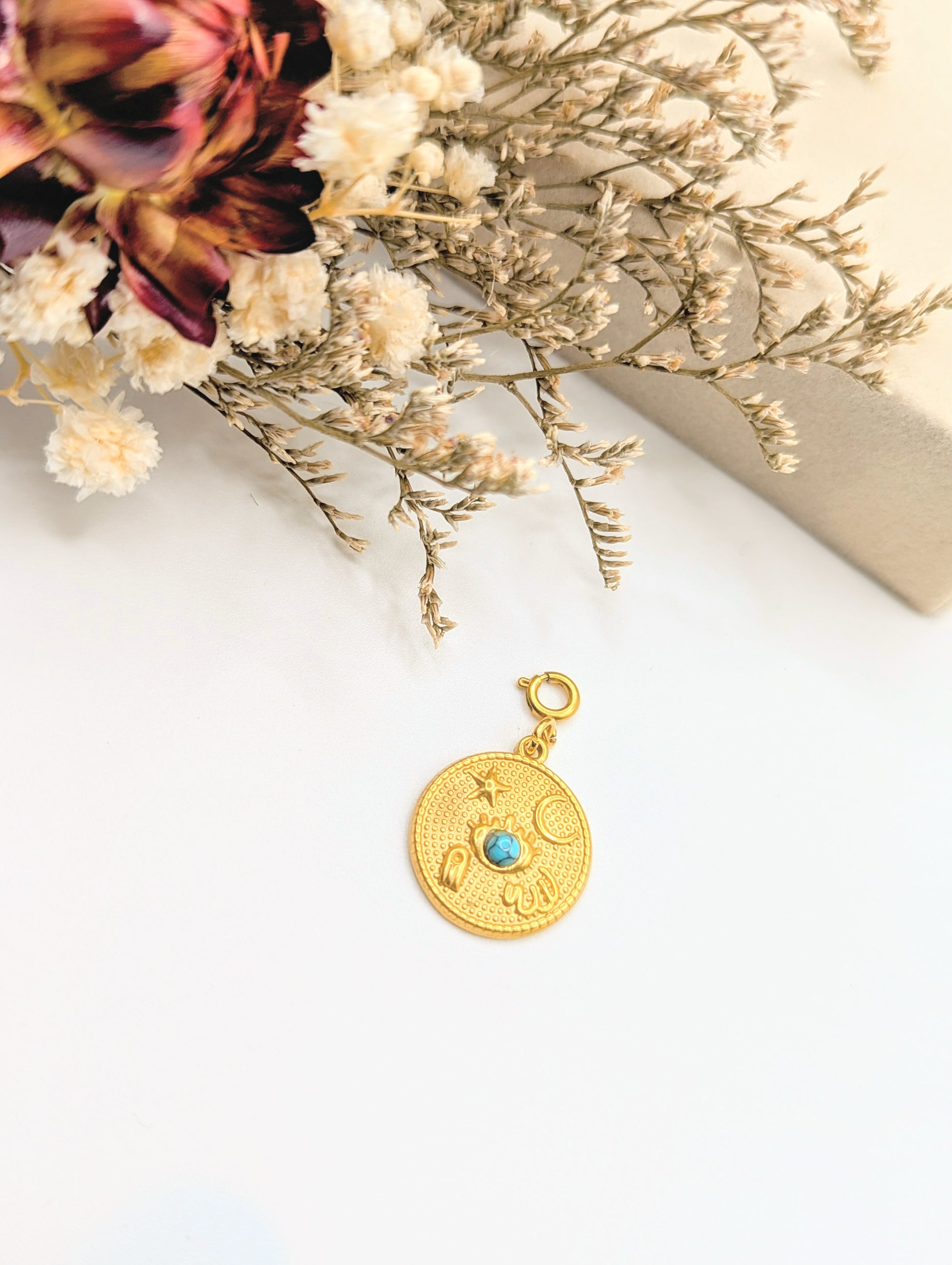 Embrace celestial elegance with the Gold Moon Coin Charm. Featuring a beautifully detailed moon engraved on a classic coin design, this charm radiates sophistication and subtle mystique. Perfect for bracelets, necklaces, or keychains, it adds a luminous accent to any accessory collection.